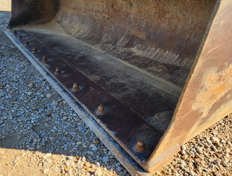 The front loader is equipped with a hydraulic quick coupler for fast attachment changes and increased versatility. It includes a 96-inch loader bucket with bolt-on cutting edge, ideal for loading, grading, and material handling tasks.