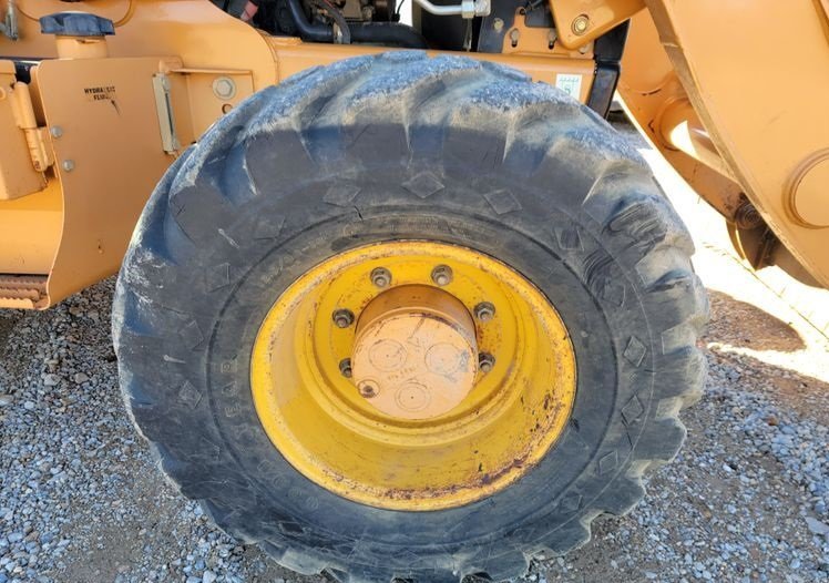 The machine rides on 12.5/80-18 front tires and 21L-24 rear tires, offering durability, strong traction, and stability across a variety of jobsite conditions.