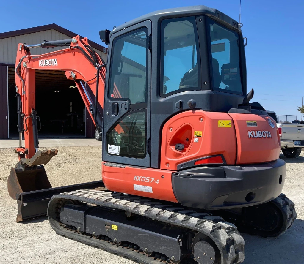 The 2016 Kubota KX057-4 mini excavator is a reliable and compact machine designed to tackle a variety of excavation tasks. Powered by a diesel engine, this excavator features an enclosed cab with both air conditioning and heating for comfortable operation in all weather conditions. With a 77-inch wide backfill blade, standard boom, hydraulic thumb, and a 25-inch wide excavator bucket with a weld-on cutting edge and 5 teeth, it offers versatility and precision. The 15-inch rubber tracks provide stability and traction, making this machine ideal for use in tight spaces.